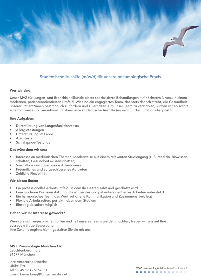 | Kontakt: | Haben wir Ihr Interesse geweckt? Wenn Sie sich angesprochen fühlen und Teil unseres Teams werden möchten, freuen wir uns auf Ihre aussagekräftige Bewerbung. MVZ Pneumologie München Ost Ihre Ansprechpartnerin: |